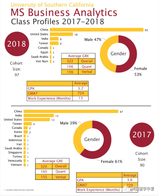 接下来将以南加州大学的business analytics项目为例,近年来business analytics的项目越来越热,而且申请对本科的专业门槛并不是很高,申请的人数越来越多,这些考试的分数也就水涨船高了。