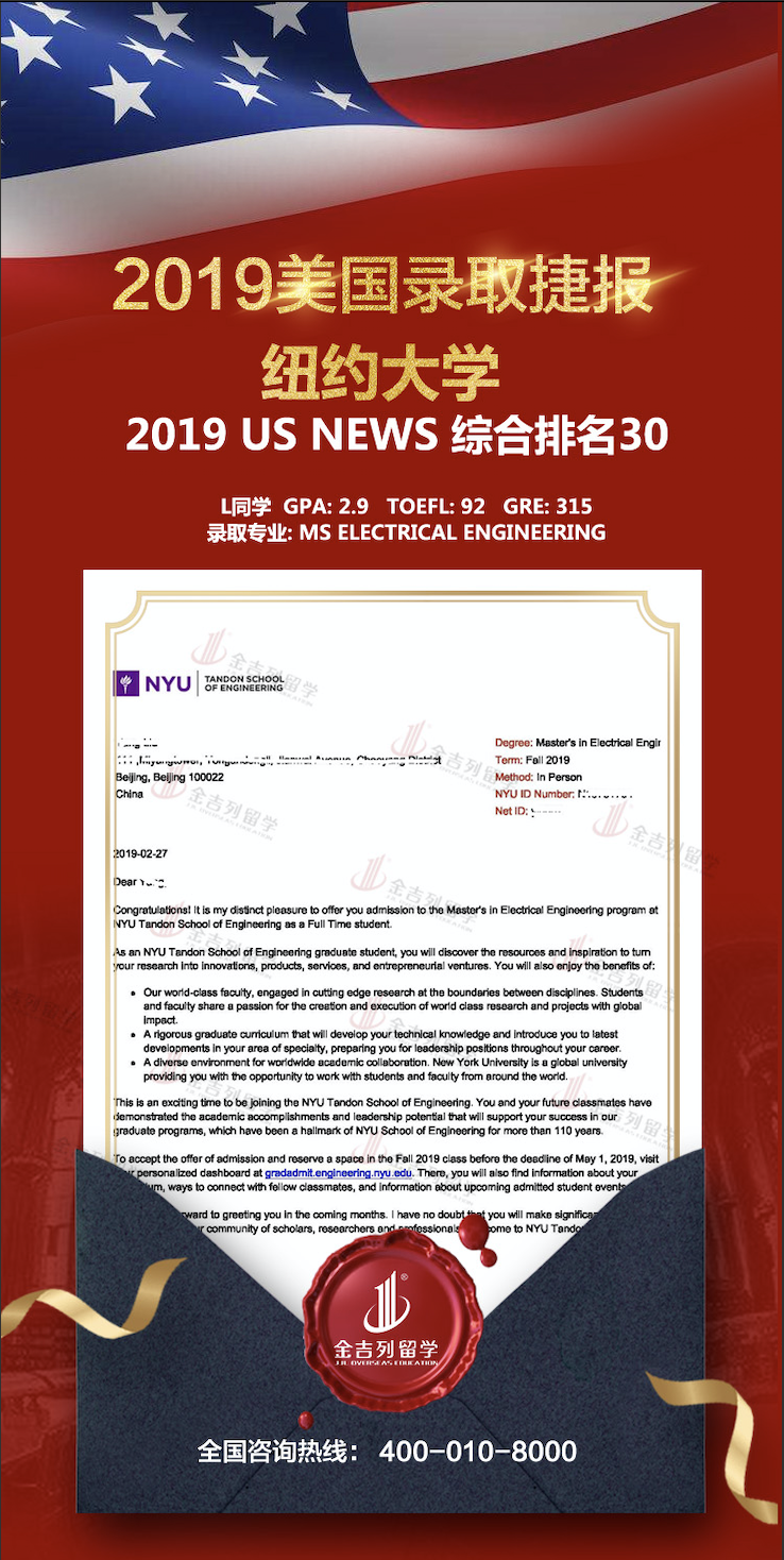 刘同学的三项标化成绩(GPA,托福,GRE)都显著低于美国Top 30排名院校平均录取的要求成绩,但是通过我们安排的名企实习——美国超微半导体公司 (Avance Micro Devices) 研发中心,以及优秀的文案水平,用文书材料的优势以及学生提升后的软实力实现低分高录、绝境逆转拿到了他梦想的纽约大学EE专业录取!