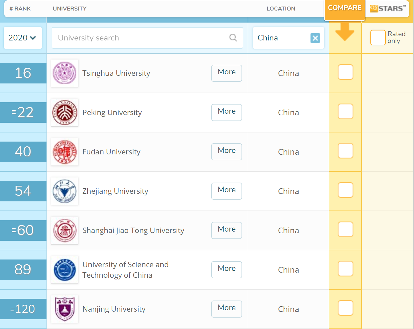 中国大陆大学在此次的排行中再创新高,清华与北大连续五年排名上升,在此次世界大学排名中都取得了该校史上最高名次。清华位列全球大学第16位,北大位居第22位。此外,中国上榜的大学还包括香港大学、香港科技大学、复旦大学、浙江大学、上海交通大学、中国科技大学、南京大学等。整体来说,中国大陆大学的学术研究影响力在持续进步。在中国大陆42所参与本次排名的大学中,有32所大学的QS论文引用指数较去年上升。下图为进入QS世界排名前200的中国大学。