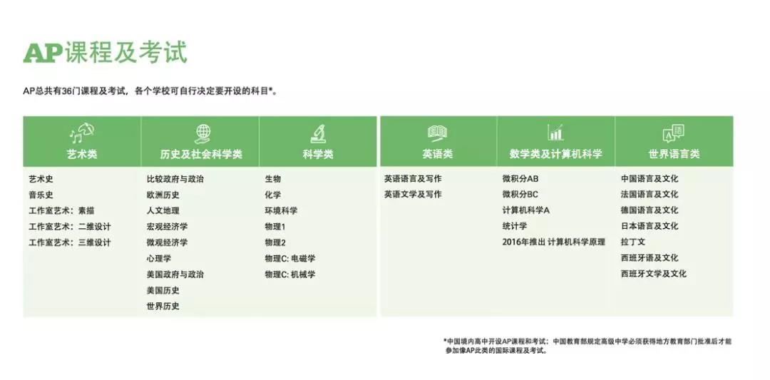 事实上,AP共有36门课程及考试,除去本次宣布在内地开放考点取消考试的四门课程外,各个准留学生依然剩有32门课程可供选择。
