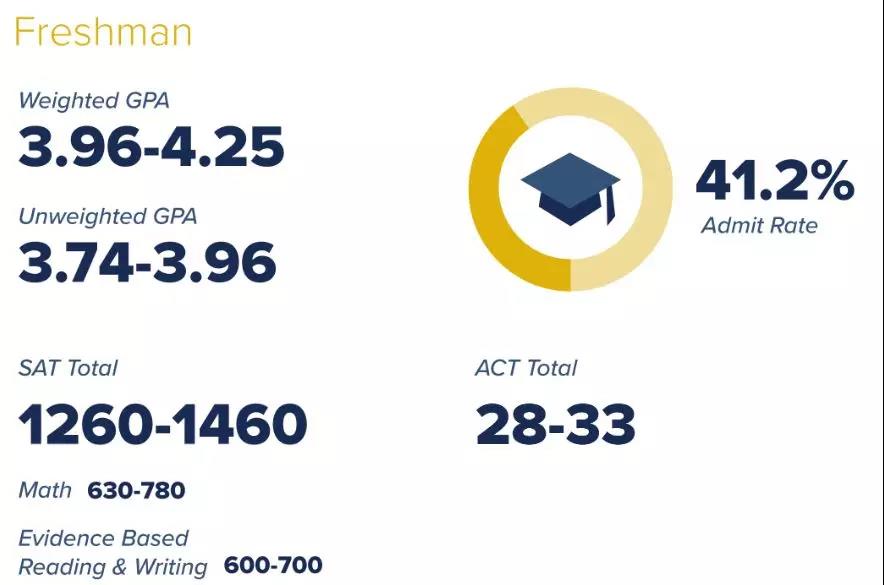 美国综合大学排名从去年46位上升到今年的38位,加州戴维斯分校和欧文分校一样, 这两年录取率一直在下降 。戴维斯分校在2018年出现了一次断崖式的下降,从 2017年60%的录取率下降到了2018年的41.2% 。从其官网的数据显示, SAT标化成绩区间为1260-1460,如果提交ACT成绩的话,建议分数在30分以上 。