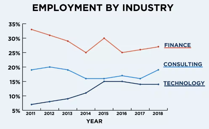 在过去的八年中,尽管求职市场变化不定,但咨询、金融、科技一直是宾大毕业生青睐行业 Top 3。
