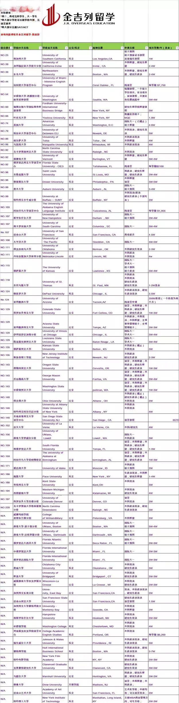密歇根大学安娜堡分校、波士顿学院、威斯康辛大学麦迪逊分校、迈阿密大学、德州奥斯汀大学、伊利诺伊香槟分校、叶史瓦大学、宾州州立帕克分校、乔治华盛顿大学、波士顿大学、俄亥俄州里大学、东北大学、福特汉姆大学、马里兰大学、雪城大学、康涅狄格大学、普渡大学、佐治亚大学等(2019春季入学大一)