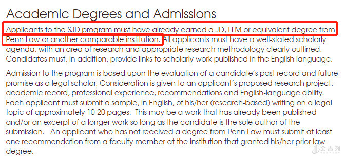 SJD/JSD是研究性博士学位,这个项目要求申请者首先具有法学硕士(LLM,是具有法学首个学位之后的进阶学位)学位才可以申请。 有些法学院具有JD的学位的申请者也可以直接申请JSD而不需要攻读LLM。 这个项目一般时长为3-5年,头一年要求学生上法学研究方法论的课程,之后的时间则由学生做独立研究,完成几百页的毕业论文。
