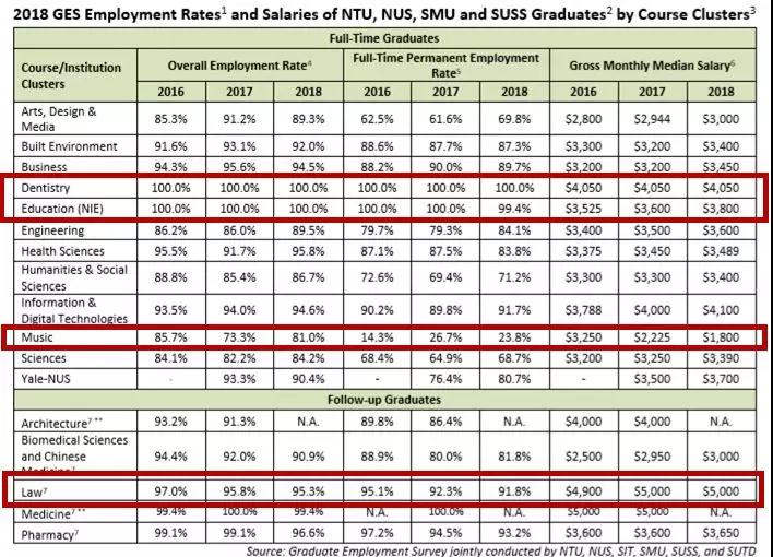 其中,新加坡国立大学、南洋理工大学、新加坡管理大学以及新跃社科大学的毕业生的总体就业率、固定工作就业率以及月薪情况如下: