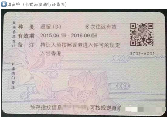 逗留签注(D签) 国家机关发给经香港或者澳门有关部门批准在香港或者澳门就学、就业、培训的人员及其家属。逗留签注为多次签注,出境有效期根据香港或澳门有关部门批准期限签发。逗留签的有效期一般为一年,期间可无限次往返香港和内地,逗留签办理好后要注意上面的信息是否正确。
