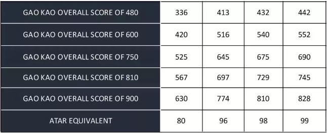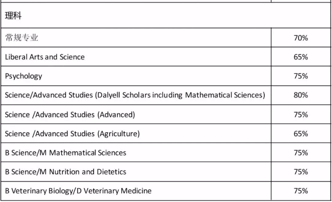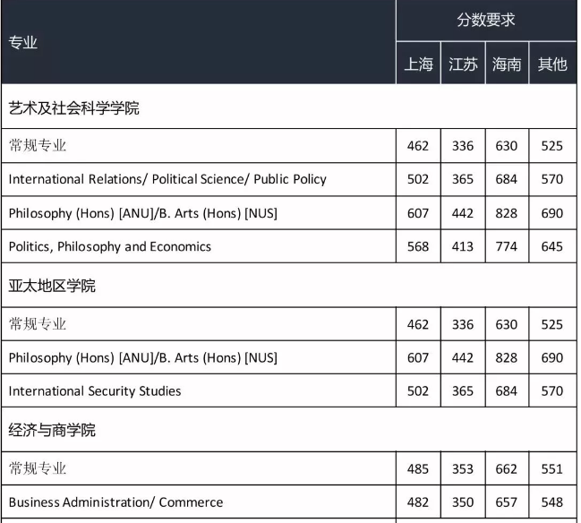 悉尼大学针对高考的分数要求以各省高考总分的百分比进行计算,要求在65%-80%不等;个别专业除高考成绩外,还设有额外的入学标准;也有个别专业不接受高考成绩,具体以入学要求为准。详见下图