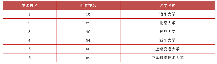 中国大陆共有2553所院校,此次榜单前100名中,中国大陆共有 6所 高校入选, 清华大学 位居中国高校之首, 排名世界第 16位 , 北京大学 紧随其后,位列世界 22名 。复旦大学、上海交通大学、浙江大学和中国科学技术大学闯入世界前100。