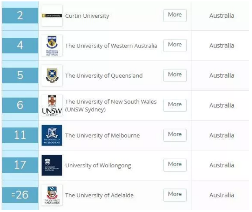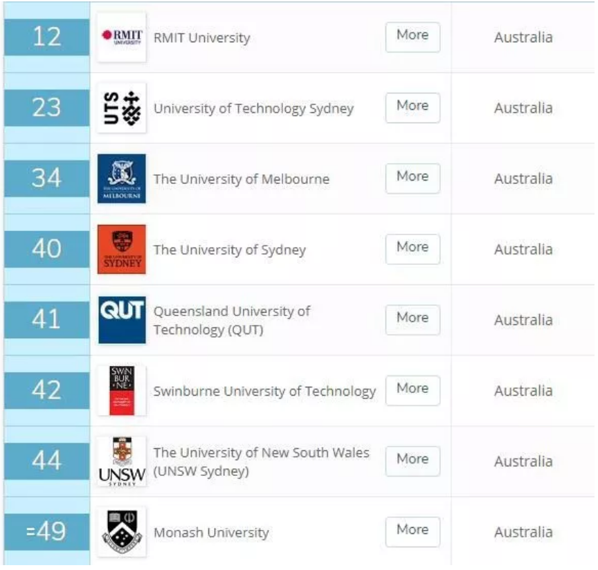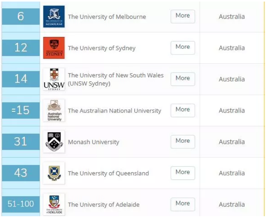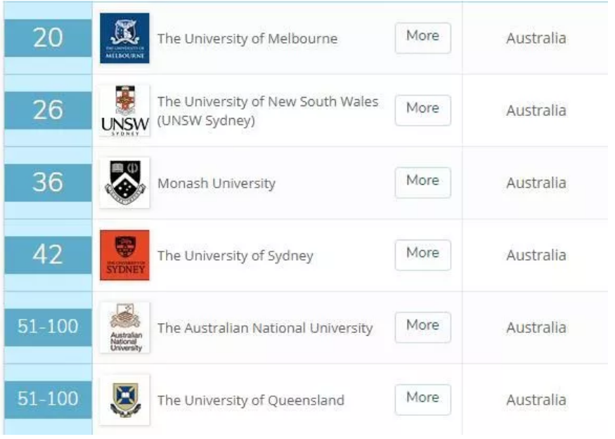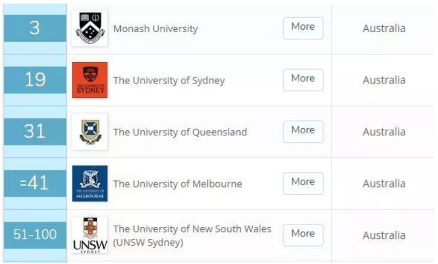 紧跟着是悉尼的两所大学,悉尼大学和新南威尔士大学分别排行12和14。