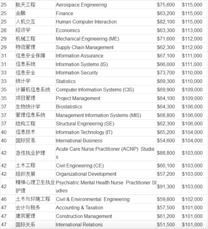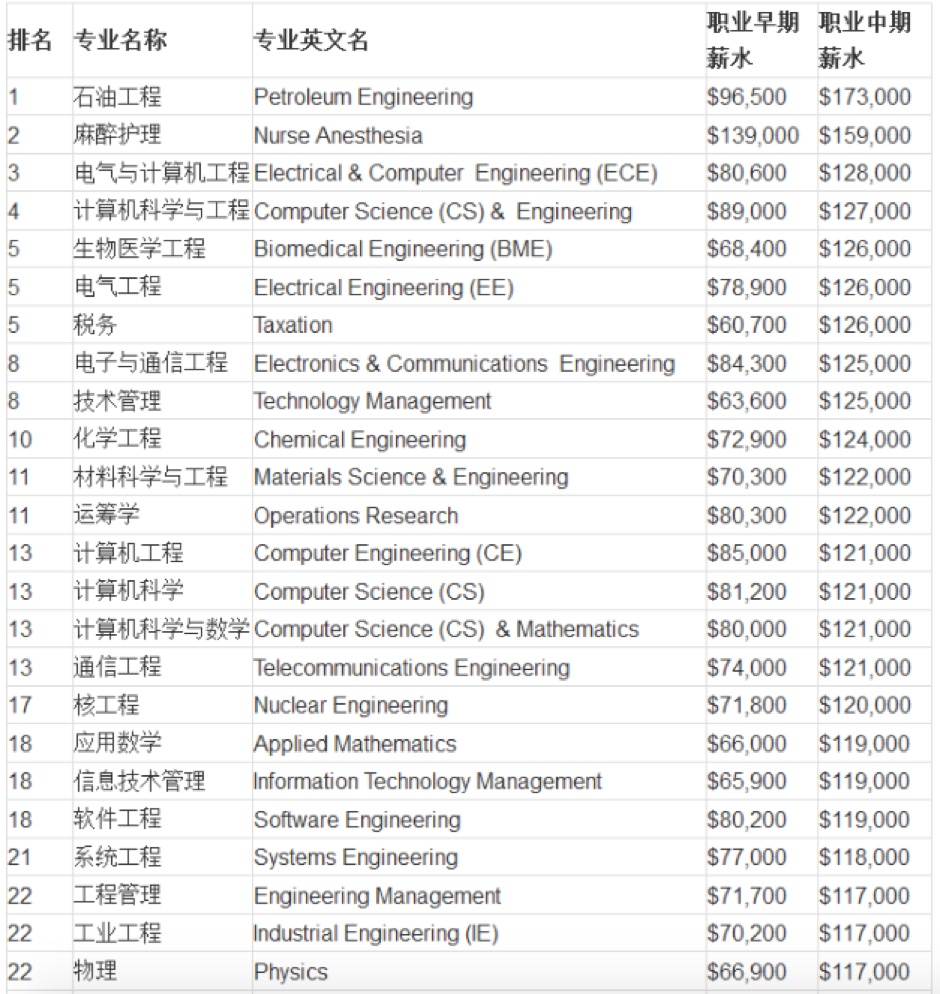 大家可以参考一下美国知名调查机构 Payscale 发布的美国大学硕士专业毕业生工资排行榜,以下是 top50 的排名。不出意料,从整体来说,工程类专业的薪资都排名靠前,医学类和商科专业也排名较高。