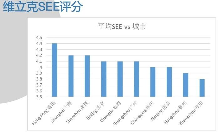 就维立克分数而言, 香港遥遥领先 ,均分高达4.4;上海深圳不分伯仲,均分4.2;北京、成都、广州平分秋色,均分4.1。从全国来看,均分最多是落在 3.5-4 这个区间。