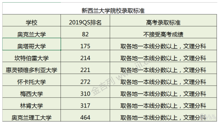 新西兰的八所大学中除了奥克兰大学还没接受高考成绩以外,其余的奥克兰理工大学、梅西大学、坎特伯雷大学、奥塔哥大学、惠灵顿维多利亚大学、怀卡托大学、林肯大学均可通过高考成绩申请大一课程。