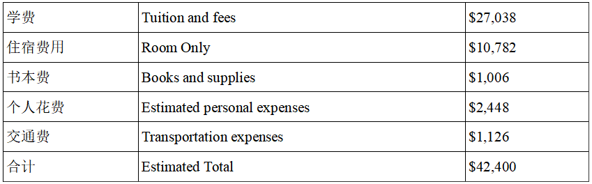 金,合计人民币25多。其中占比最大的项目是学费$22,116,其他的项目有住宿费$12,426,书本费$1200,个人零花钱$1065,交通费$400,该校多次被福布斯提名“美国最具价值大学”榜单。怎么样,这样的学校有没有让你心动。如果还不能满足你的要求,请见下一所学校。