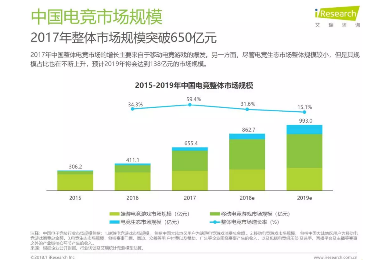 根据艾瑞咨询《2019年中国电竞行业研究报告》数据,中国电子竞技市场自从2017年突破650亿元规模后,预计将能在2019年超过900亿元。
