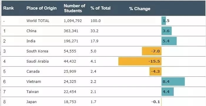 根据教育部最新数据显示,连续九年,中国一直是美国留学第一大生源国,2017/2018年度共计有363,341名中国大陆留学生赴美留学,占据总留学学生人数的33.2%,贡献了超138亿美元。