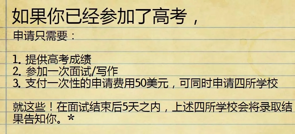 新增的4所接受国内高考成绩的大学, 需要通过美国名校普遍认可的第三方面试机构初鉴InitialView的面试, 并提交 最新的高考成绩单 ,以及 50美元 的一次性初鉴面试及大学申请费用 (常规的初鉴面试费用在220美元),即可同时提交申请给这4所大学。