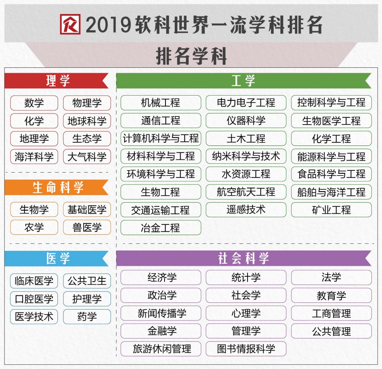 2019年软科世界一流学科排名覆盖了54个学科,涉及理学、工学、生命科学、医学和社会科学五大领域。