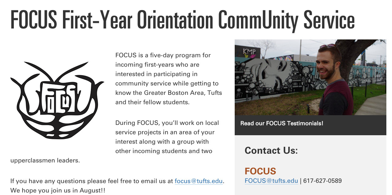秉承着这样的使命,塔夫茨大学非常重视培养学生的公民社会活动和公共服务意识,比如从大一新生还未入学时, 就需要参加一个叫做FOCUS (Freshman Orientation for CommUnity Service)的活动 。