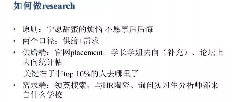 供给端 也就是我说会看一些学校官网上的placement,然后在CD论坛上也会有往届的师兄师姐发一下这届summer的去向、full-time的去向等。我记得CD上去年发了一个非常火的帖子就是细数LBS MIM和MFA的去向,就是这种类似的帖子我都会去做参考,然后我会把他们这些去向列入到Excel表之中,进行一个统计,然后关注这些非常top的学生去向之外,我其实更关注非前10%的人去哪里,因为就我个人理解,我们其实更容易成为后90%,那么这90%的人去哪里,就很有可能是我们未来的去向,所以大家比起去非常general的搜索这些信息之外,应该更需要关注一下后面的人去哪里了这件事情。