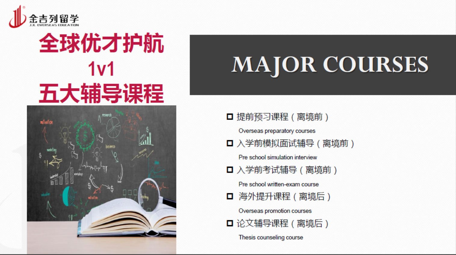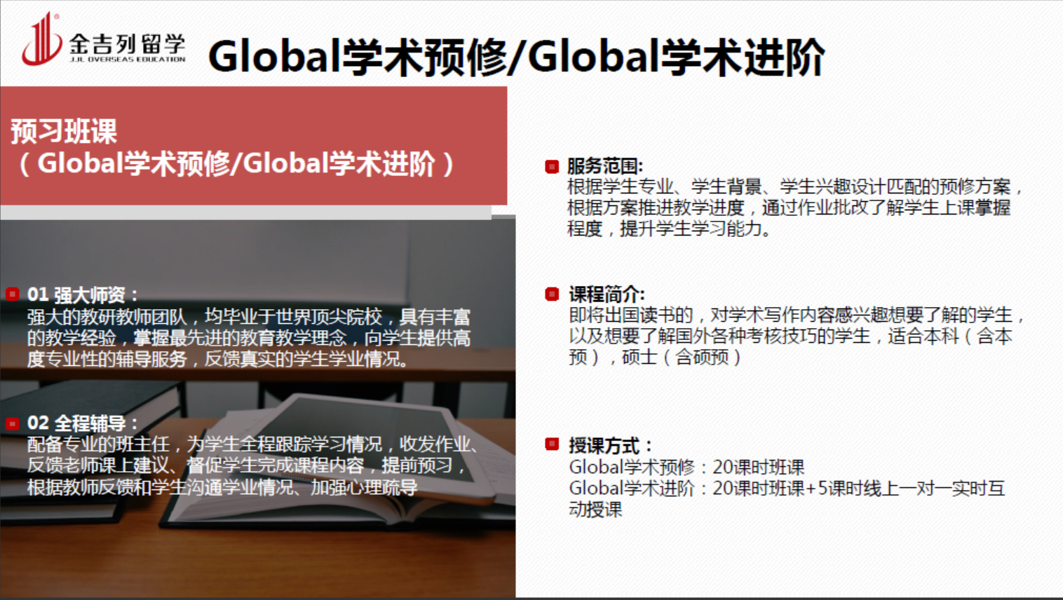 GLOBAL学术预修与进阶 分为两种课程,行前预修通识课程专为申请本预、本科、硕预、硕士水平海外课程中国留学生倾心打造,让学生未出过门,便熟练掌握海外教学必备思维与技能。进阶课程是金吉列为广大学子独家定制的通识学术预习加1V1专业课程深度预习课程,在行前做好12分准备。