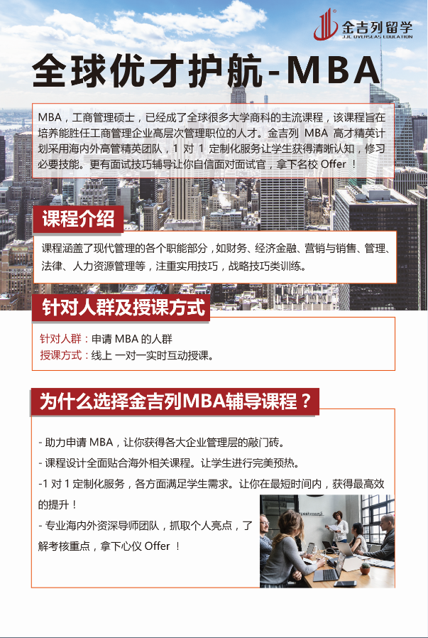 全球优才护航-MBA MBA,工商管理硕士,已经成了全球很多大学商科的主流课程,金吉列MBA高才计划1对1定制服务让学生获得清晰认知、修习必要技能,更有面试技巧辅导让你自信面对面试官,拿下名校offer。