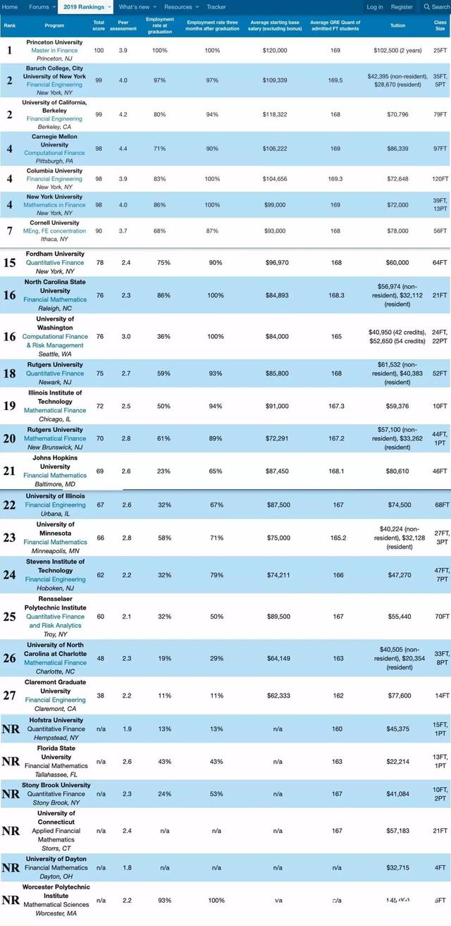 Stuent selectivity(学生录取难度):25%,综合考察指标包括GRE分数、本科GPA、项目录取率。金融工程在美国也叫数量金融、部分院校等同金融数学,是金融硕士中专业性最强的一种项目。金融工程广泛使用模型,用数学方法分析股票走势、收益率曲线,分析各种债券等的定价规律、作用以及应用策略。可以说,金融工程是金融学与数学,计算科学,计算机科学交叉渗透形成的学科。