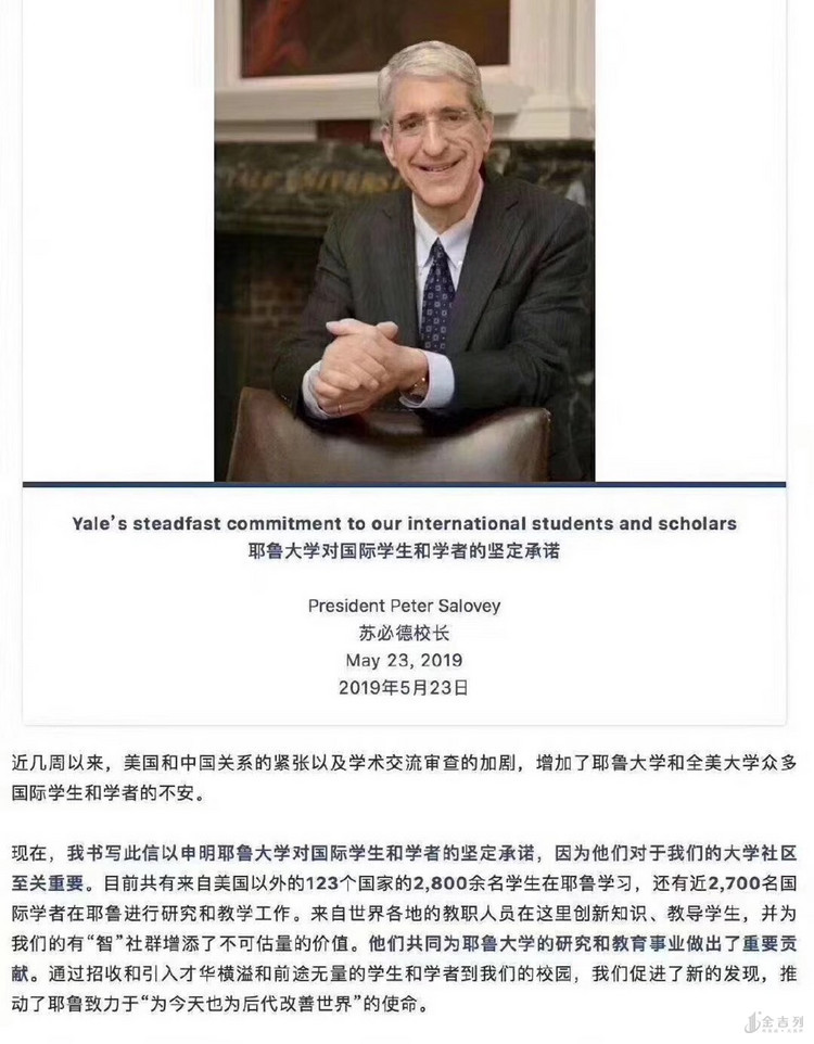 5月23日, 耶鲁大学 校长彼得·沙洛维(Peter Salovey)以《耶鲁对国际学生和学者的坚定承诺》为题,致信全校师生。强调耶鲁坚持欢迎来自世界各地的优秀同仁。他也表示,耶鲁非常重视所有的法律和监管要求。