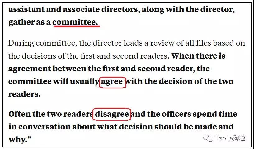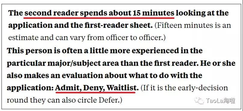 在学生递交完申请后,学校会受到一份详细的学生学术,活动,文书,等等信息。第一审核人会用平均15分钟快速读取申请人信息并做出是否录取的决定:录取,拒绝,等待名单。