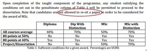 必须均分达到50%(50分),并且满足到达50%(50分)的科目加起来的学分在80分以上,毕业论文的分数也不能低于50%(50分)。如果论文挂了,就与硕士学位无缘了,因为明文规定“not allowe to re-sit a paper”(不能够“补考”论文)。但也有特殊情况,遇上比如亲友过世这类的重大变故,造成论文失利,也许可以找学院商议,再次提交论文,但仍旧机会渺茫。