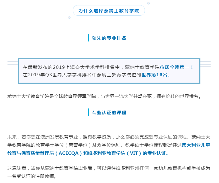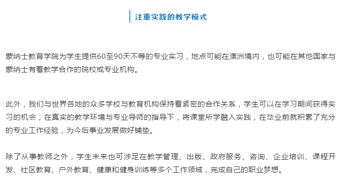 在蒙纳士大学,教育学专业培养的不仅仅是传统意义上的教师,而是一名真正的教育家。蒙纳士大学在科研及教学上常年保持的世界领先排名,为毕业生在世界各地就业市场极大增强了专业认可度与竞争实力。