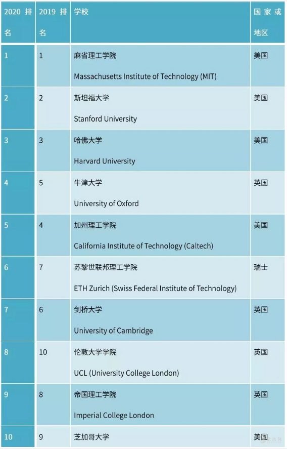 好在MIT连续八年保持在霸主地位,斯坦福大学和哈佛大学也紧随其后保住了前三名,加州理工和芝加哥大学纷纷下滑一名,分别位列第5和第10。