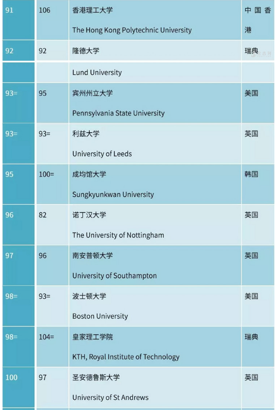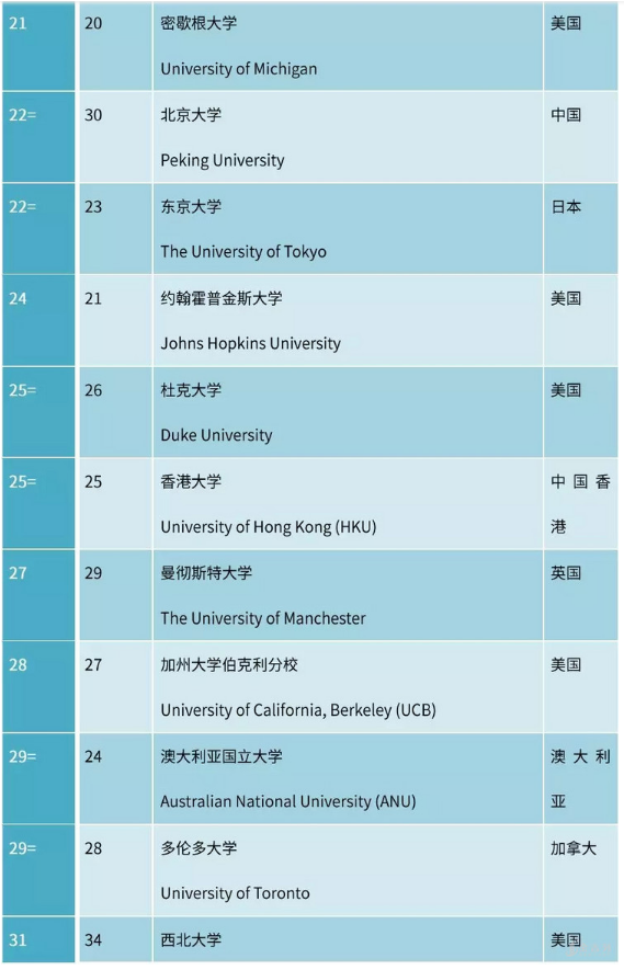 进入前100排名的依然有6所来自中国大陆 。 其中清华大学继去年挺进前20之后,今年再次上升一位,排名16 ;北京大学也从去年的30名一跃成为22名,进入前20有望!