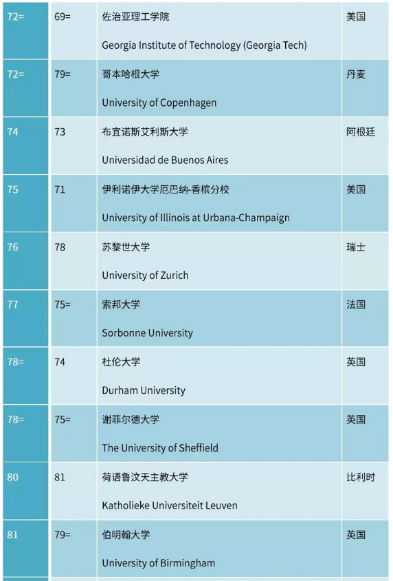 同样作为老牌教育之国的英国在整体排名上也有下滑趋势,84所参与排名的英国大学中50所都有下降,只有12所上升,剑桥大学更是出现了五年来的第一次下跌,由去年的第六名变为今年的第七名,第六名被来自瑞士的苏黎世联邦理工学院夺得。