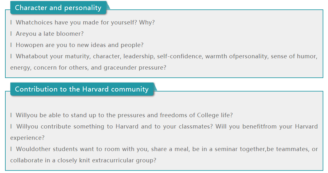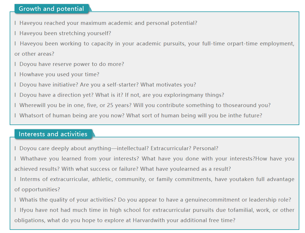 Harvar University会Growth an potential,Interests an activities,Character an personality,Contribution to theHarvar community这4个点去考察。具体我们可以看看学校的细节提示: