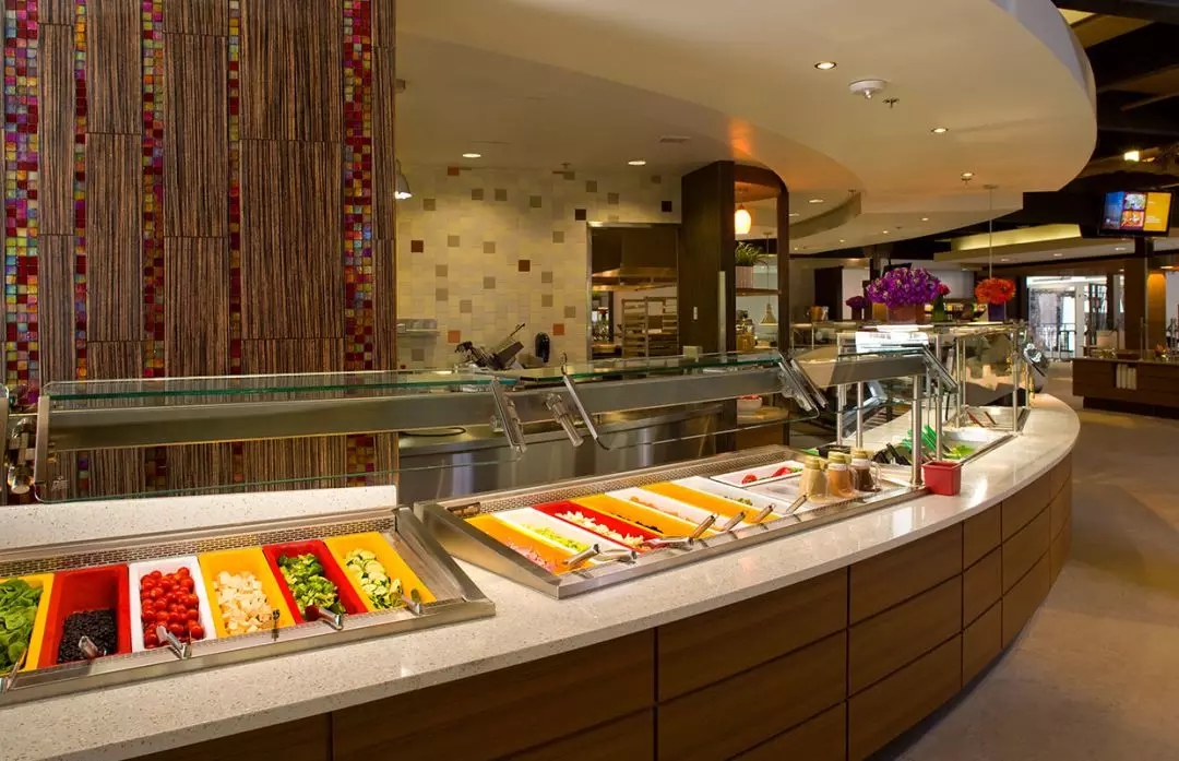 不仅保证学生吃得开心,华大还有一个 Bear Balance 的传统,保证 每餐至少提供五种水果、五种蔬菜和两种全谷类制品 ,并且最多只提供一种油炸类食品等等,还会在菜品旁贴上卡路里总量,倡导学生们健康饮食,跟 freshman 15 说拜拜!