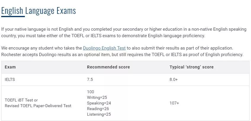 对于非美国本土学生以及高中不在美国的学生来说, 罗切斯特大学接受 多邻国(Duolingo English Test)成绩 ,但 仍然要求托福或雅思作为英语水平的证明 。