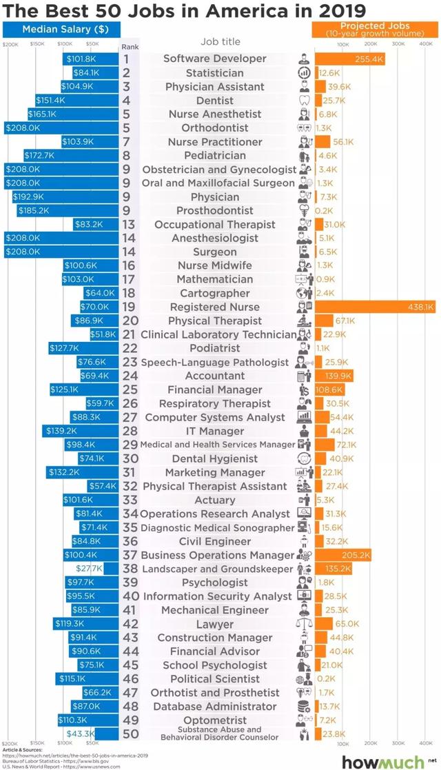 美国财务数据网站Howmuch.net根据《美国新闻与世界报道》的Best Jobs Ranking(最佳工作排名)对美国50个最好的工作进行了排名。