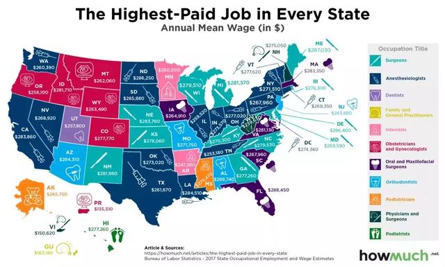 除了全美范围的统计外,Howmuch.net还根据美国劳工统计局(U.S. Bureau of Labor Statistics) 的年度平均工资数据,列出了美国各州薪资最高的工作岗位。