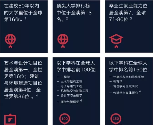澳大利亚十佳大学之一。因出色的职业发展和就业服务而获得了国家毕业生职业咨询服务协会的最高奖,RMIT侧重于学生的就业,毕业生就业率高,起薪点高。