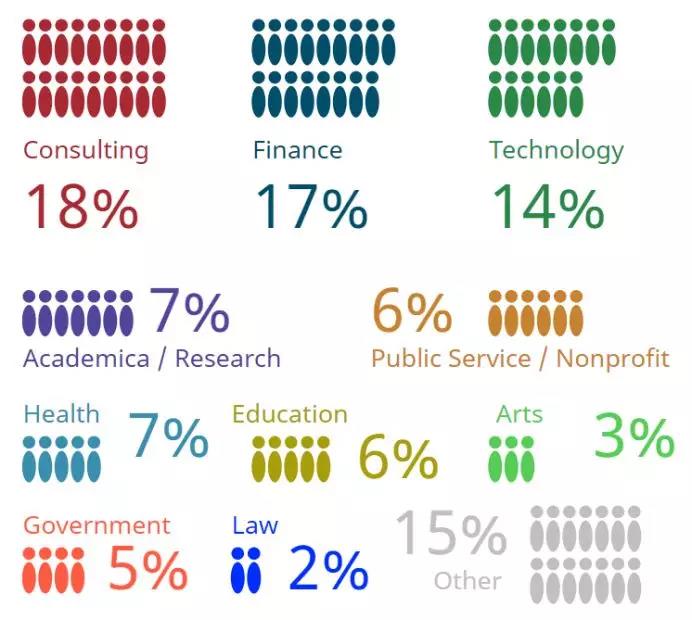 但是,我们从这个图可以看到,它们的学生毕业之后 去到的地方真的是五花八门 ,而且很多都是 医疗卫生、政府机构、公共服务、非营利性机构、学术研究 这些领域。