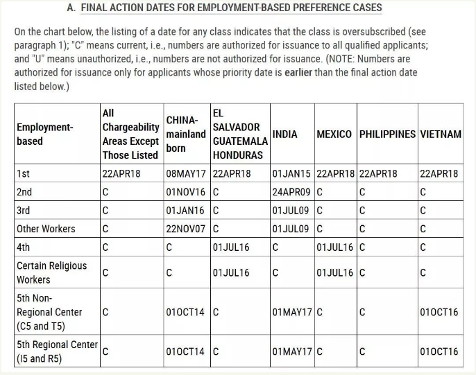 2019年7月的排期表出炉了,我们一起看看可获得绿卡名额并且取得I-485批准的排期表A: