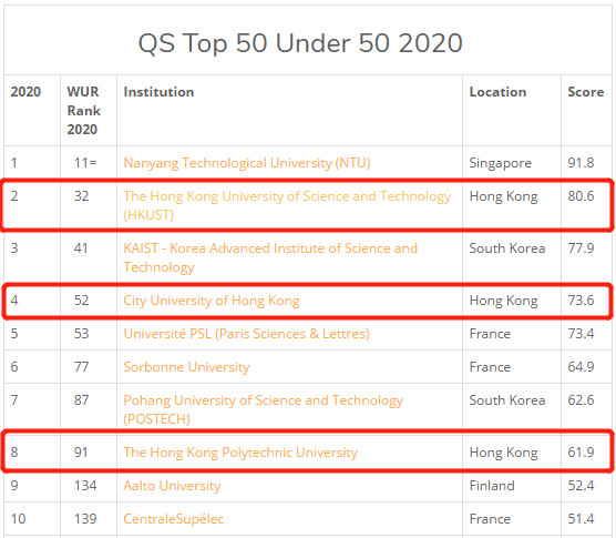 本次QS世界年轻大学排行榜,香港有四所高校进入榜单,并且三所占据榜单前十位,他们分别是 香港科技大学(排名第二),香港城市大学(排名第四),香港理工大学(排名第八), 香港浸会大学(排名第二十六)