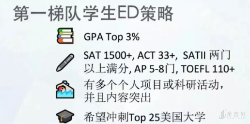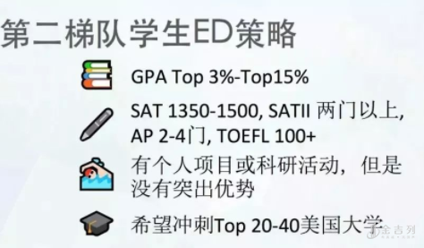 第一种是比较冒进一点的,他们的分数可能在1400到1500分,希望通过ED能够冲进一所前三十的学校。虽然此时的分数并不是特别高,但ED的时候会选择一个“梦想”的学校去冲刺。