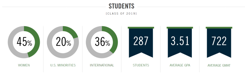 录取学生的平均情况,女性:45%,平均GPA:3.51,平均GMAT722