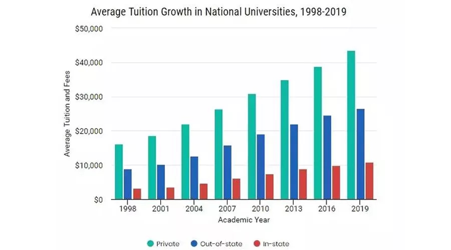 毫无疑问,美国大学学费是全球最高的,并且依然每年都在小幅度上涨。 据 US news 统计,近 20 年来,美国私立大学平均学费涨幅为 168% ,公立大学州外学生学费涨幅 200% ,州内学生学费涨幅为 243% ,飙升的大学教育成本,导致全美学生贷款已经突破 1.5 兆美元。