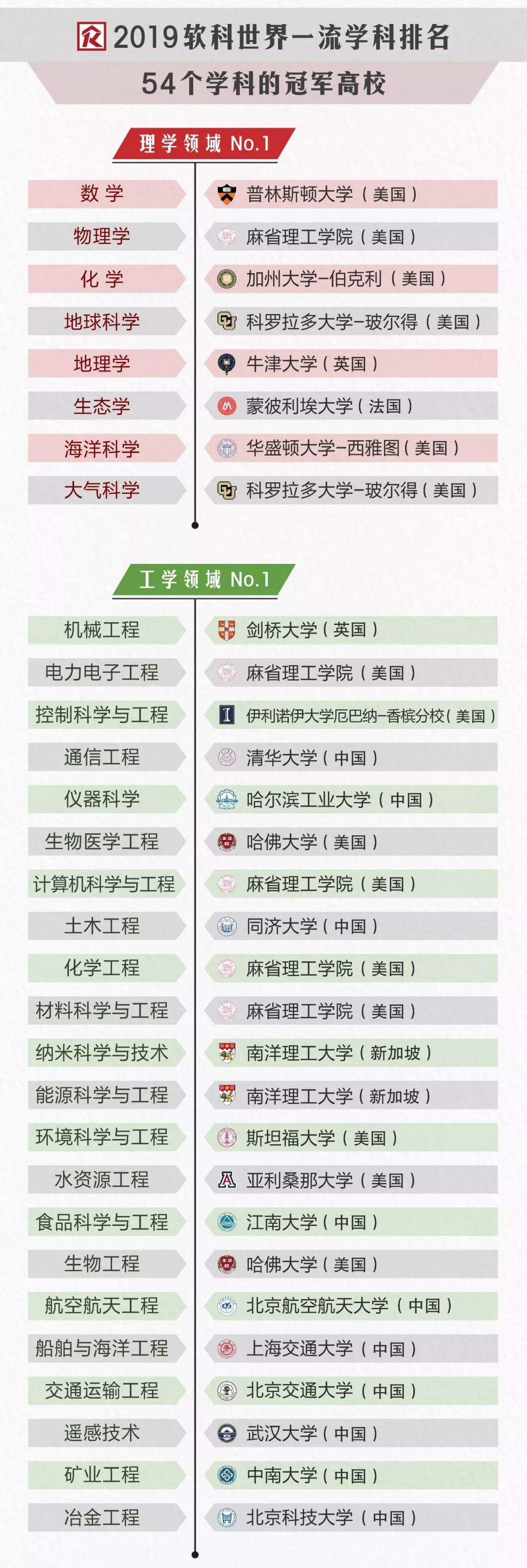 2019 年排名覆盖54 个学科,涉及理学、工学、生命科学、医学和社会科学五大领域。