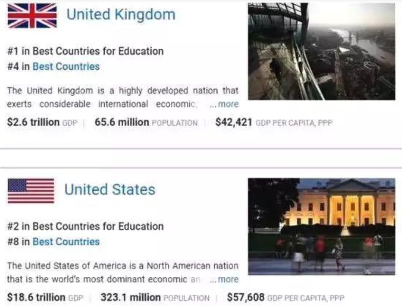 由US News评选的,2018年世界最佳国家(Best Countries 2018)榜单中,英国以其享誉全球的高水平教育质量力压美国,成为2018世界教育最佳的国家(Best Countries for Eucation)!