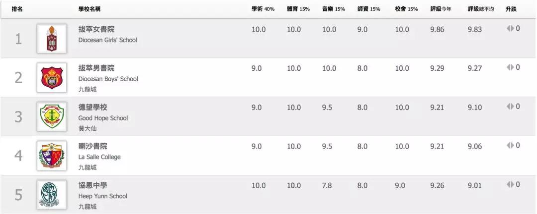 其中创立于 1860年的 拔萃女书院 , 其全港排名第一、在直资中排名也为第一,主要因其名人校友辈出,并采用英文教学、学生多才多艺,常为学校在校际音乐,朗诵节及田径比赛等比赛赢取奖项。其学费每年约港币 38,000左右。