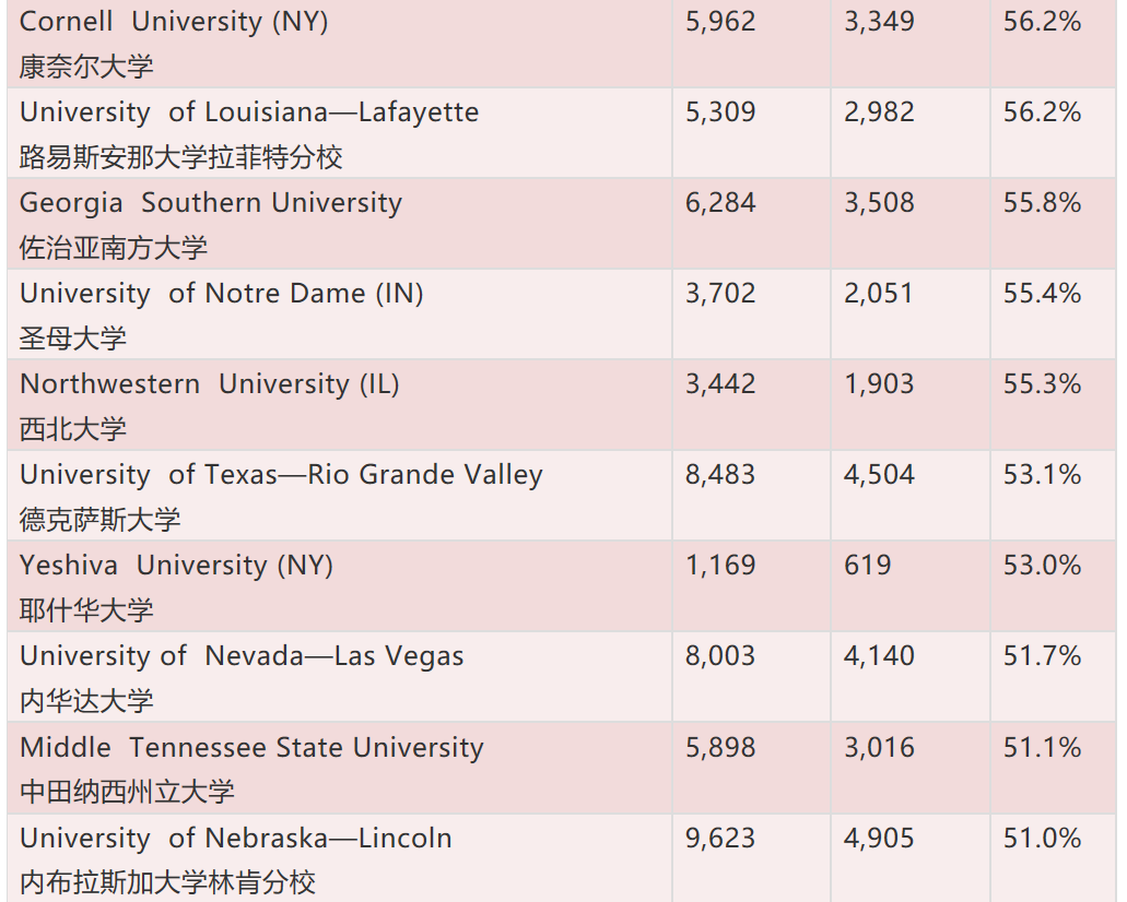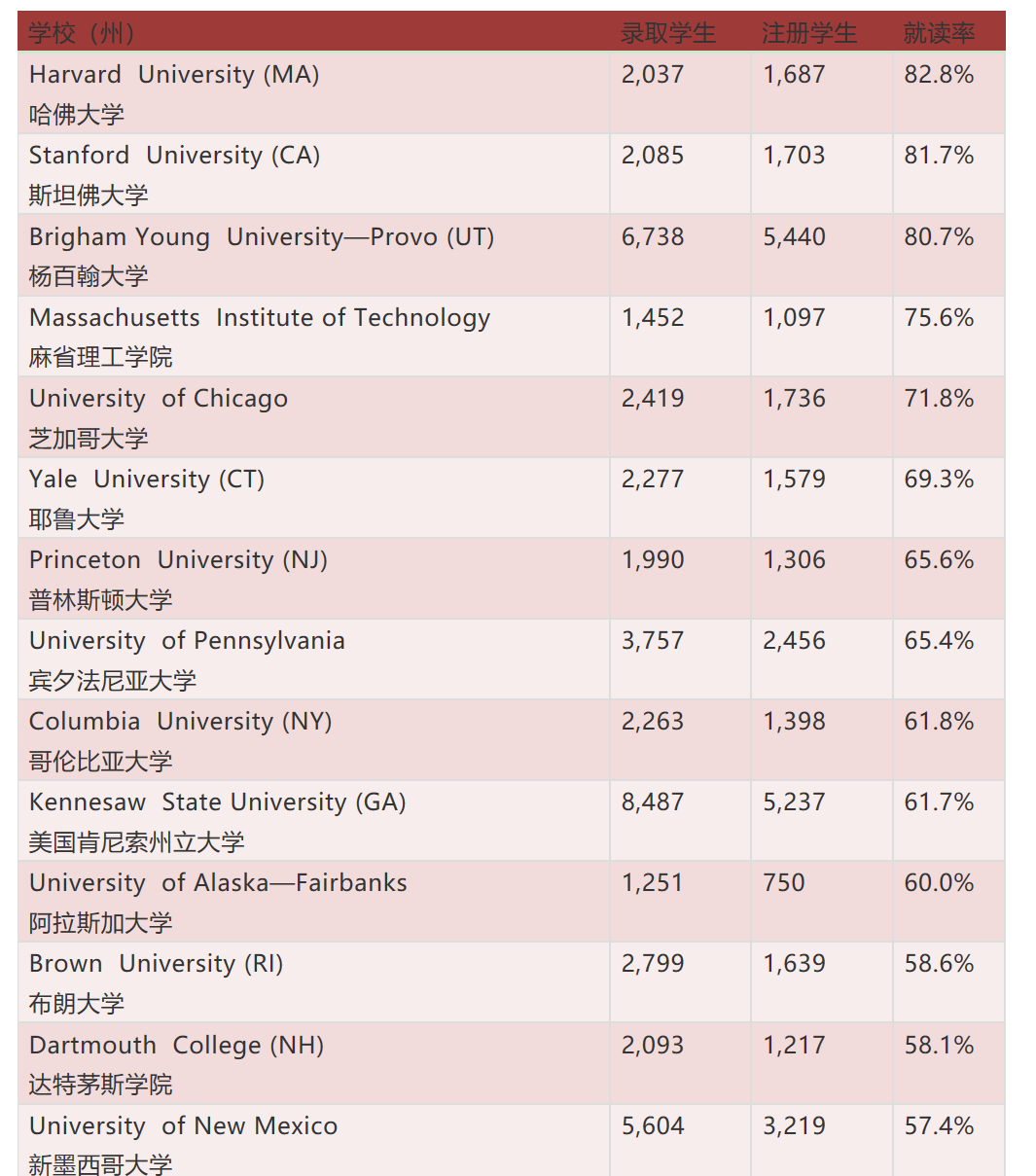 要是想知道哪所大学最受欢迎,还是要看哪所学校的入读率最高,就是拿到Offer并且选择在这所学校上学的人数。根据USNews的数据显示, 美国一些顶尖学校的入读率达到80%或更高 。马萨诸塞州的哈佛大学拥有82.8%的入读率,是综合性大学中最高的一所。毕竟谁能拿到哈佛大学的Offer,但是选择不去呢?