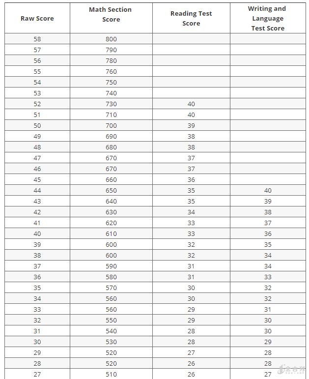 Reaing和Writing 计分原则是分别统计Correct Answers(正确答案)、 Incorrect Answers(错误答案)、Omitte Answers,通过Correct Answers(正确答案)的数量,与SAT原始数据表(RAW Score)对应分数乘以10再相加,成为该部分总分。